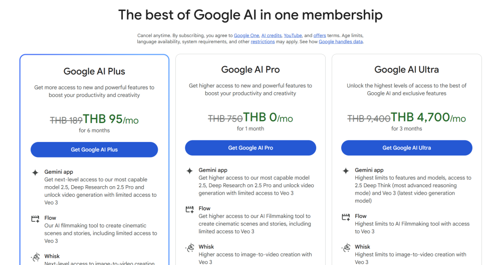 ราคาแพ็กเกจ Google AI ในไทย ตอนนี้มีทั้งหมด 3 ระดับคือ