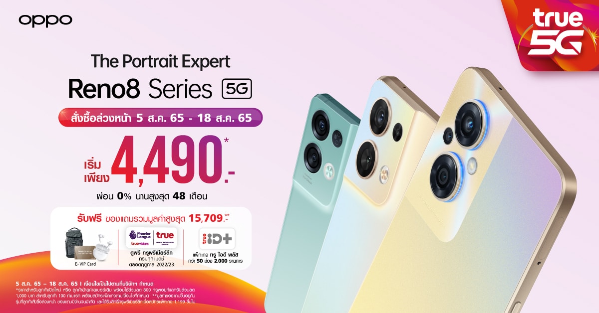 เป็นเจ้าของ OPPO Reno8 Series 5G ในราคาเริ่มต้นเพียง 4,490 บาท จากราคาปกติ 12,990 บาท เมื่อสมัครพร้อมเปิดแพ็กเกจตามที่กำหนด พิเศษกว่าใคร สำหรับลูกค้า 100 ท่านแรก ใช้คะแนน 800 ทรูพอยท์แลกรับส่วนลดเพิ่ม 1,000 บาท และรับฟรีของสมนาคุณสุดพิเศษ! สำหรับผู้ที่จอง OPPO Reno8 Series 5G รับฟรี E-VIP Card ประกันหน้าจกแตก พร้อมสิทธิพิเศษมากมาย ไม่ว่าจะเป็น ดูฟรีทรูพรีเมียร์ลีกตลอดฤดูกาล 2022/23 และ ดูฟรี แพ็กเกจ ทรู ไอดี พลัส กว่า 50 ช่อง 2,000 รายการ มูลค่ารวม 15,709 บาท พร้อมโปรผ่อน 0% นานสูงสุด 48 เดือน