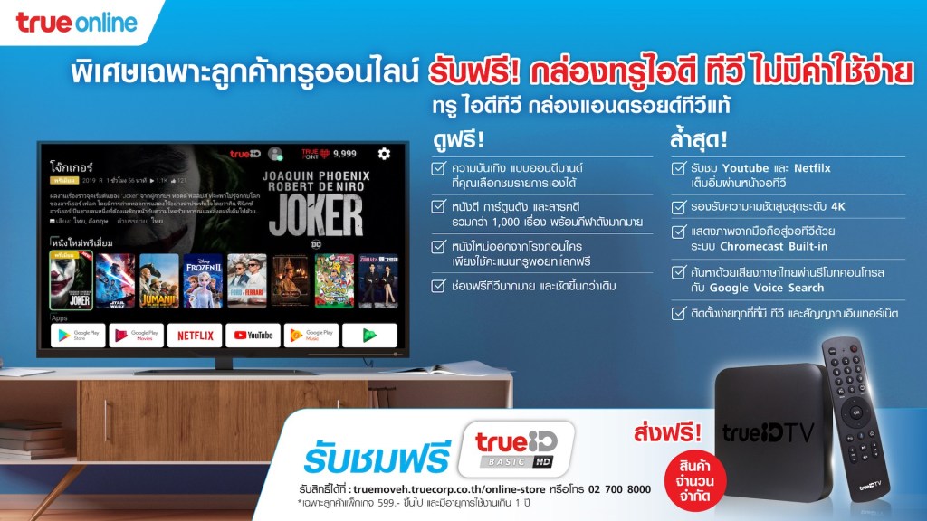 โดยทรูออนไลน์ พร้อมส่งมอบกล่อง TrueID TV ฟรี สำหรับลูกค้าทรูออนไลน์ แพ็กเกจ 599 บาทขึ้นไป และมีอายุการใช้งานมากกว่า 1 ปี ไม่ต้องเสียค่าบริการรายเดือนเพิ่ม โดย TrueIDTV เป็นกล่องแอนดรอยด์ทีวีแท้ กล่องอัจฉริยะ ที่จะเปลี่ยนทีวีเดิมให้เป็นมากกว่าสมาร์ททีวีสามารถดูหนังดังระดับออสการ์ ดูช่องฟรีทีวีมากมาย พร้อมรับชมความบันเทิง แบบออนดีมานด์ ที่สามารถเลือกชมรายการเองได้ ในเวลาที่ต้องการ ทั้งหนังดีและการ์ตูน ฟรีกว่า 1,000 เรื่อง อีกทั้งยังสามารถดูหนังใหม่ที่เพิ่งออกจากโรงภาพยนตร์ได้อีกด้วย เพียงใช้คะแนนทรูพอยท์แลก เริ่มต้นเพียง 219 คะแนน หรือเงินสดเริ่มต้นเพียง 149 บาทเท่านั้น นอกจากนี้ ยังสามารถรับชม Youtube และ Netfilx แอปพลิเคชั่นสุดฮิต โดยสามารถแสดงภาพจากสมาร์ทโฟนสู่จอทีวี ด้วยระบบ Chromecast และยังค้นหาด้วยเสียงภาษาไทยผ่านรีโมทได้อีกด้วย ซึ่งมั่นใจได้ว่าสิทธิพิเศษ ที่ทรูออนไลน์ จัดให้ครั้งนี้ จะทำให้ลูกค้ามีความสุขและสนุกเต็มอิ่มกับการอยู่บ้านมากยิ่งขึ้น”