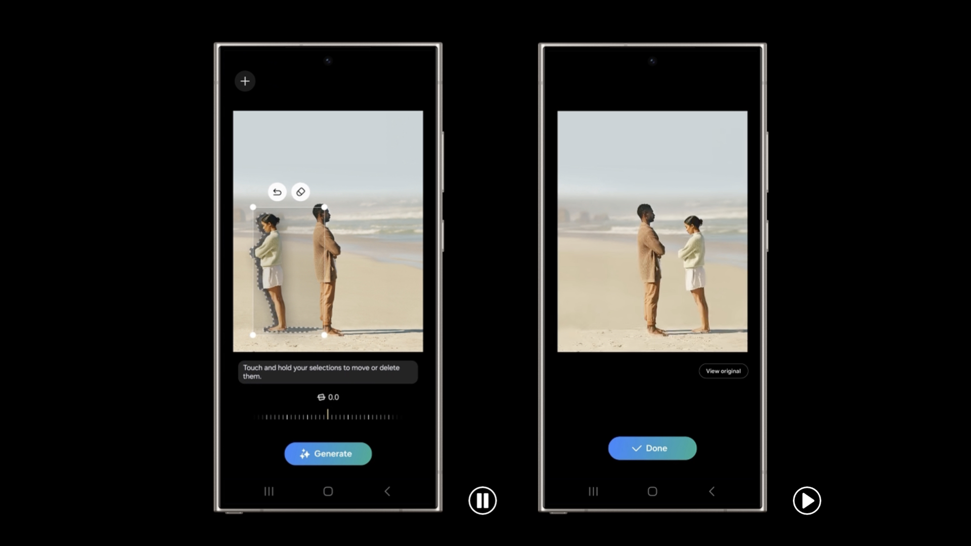 ฟีเจอร์ AI พัฒนาเรื่องการแต่งรูปให้ดีขึ้นจากรุ่นก่อนหน้า ไม่ว่าจะเป็นการลบวัตถุ ลบคน รีมาสเตอร์ หรือใช้ Generative Edit ให้ความรู้สึกเหมือนย้าย Photoshop มาอยู่บนมือถือเครื่องเดียว สมมติว่าผู้ใช้ถ่ายภาพมาแบบเอียงๆ แล้วอยากจะ Rotate รูปให้ตรงก็สามารถใช้ AI Generative เติมเต็มรูปภาพได้ หรือการย้ายวัตุก็ทำได้เช่นกัน เรียกได้ว่า ครบ จบ ในมือถือเครื่องเดียวจริงๆ